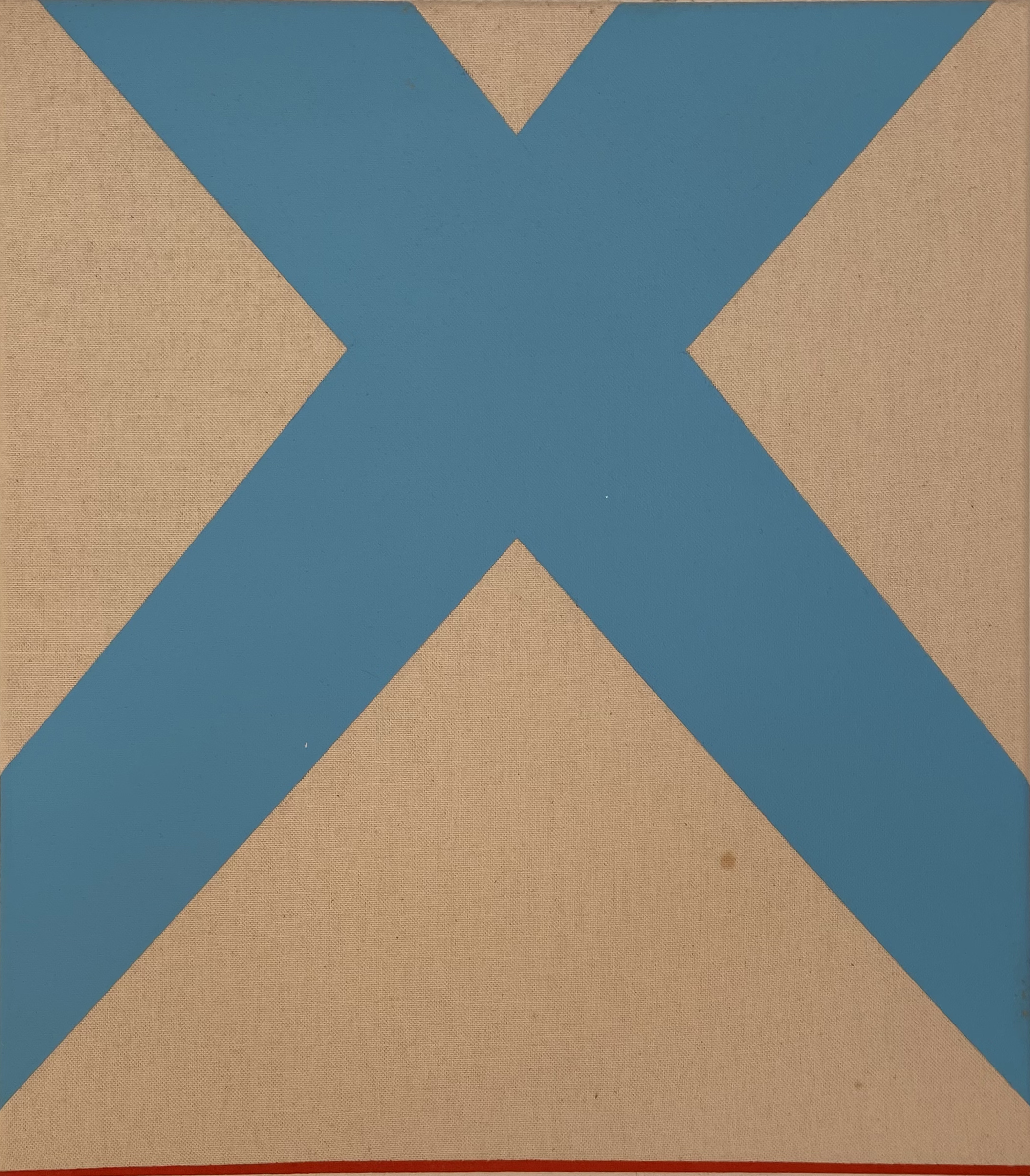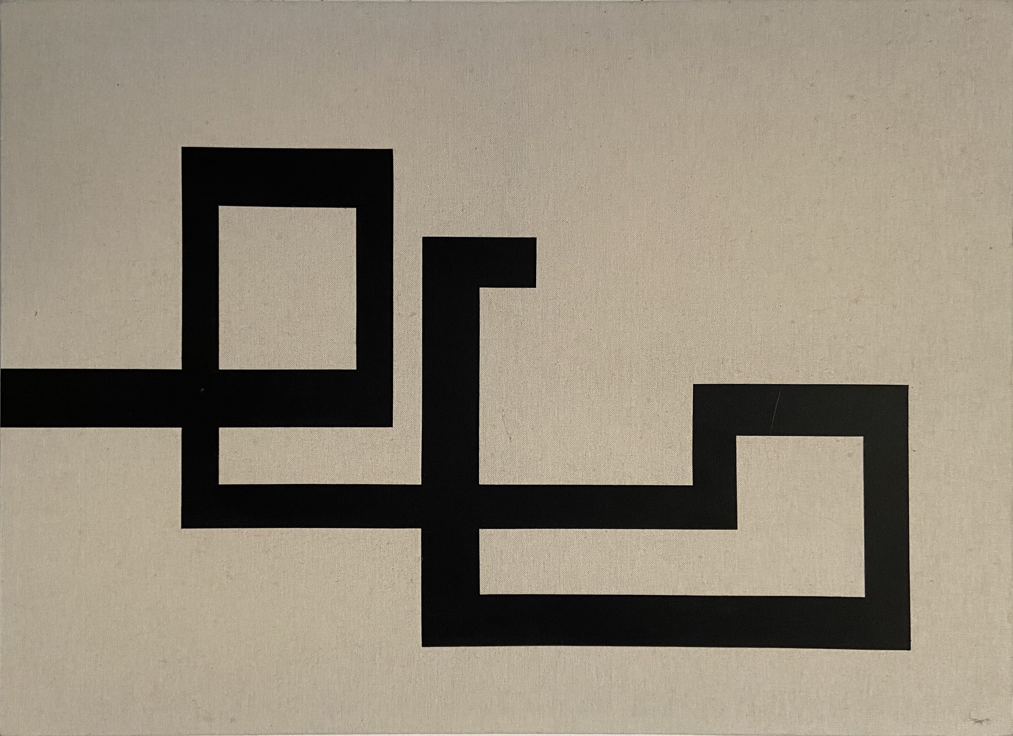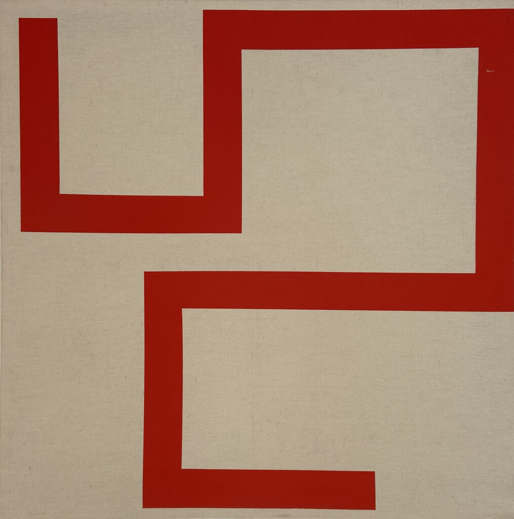 In a certain space and its specific time, movement is represented by a line. The line is a substance of form. Time creates form and has its own speed. In time, speed constructs rhythm. If one imagines history as an abstractical form, it consists of different rhythmical ongoing movements. Notwithstanding its changibility and similarity, it never repeats. In the painting this movement starts in eternity and moves towards infinity. Similarly, if one considers the line of the horizon, this horizontal line by itself doesn’t provide us the possibility to imagine earth as it is in its completeness. This constitutes the symbolic value of the line. Next to the symbolic aspect, the line for a painting necessitates a visual and aesthetical side. The main factor in the aesthetics of the line, regardless of its form, coincides with its degree of perfection. In the process of taking out unnecessary and superficial inequalities, a state of transcending beauty can be reached by which something is brought to artistical value. As Malevich said “Sandpaper finalizes that, what the file couldn’t make”. The painting is not negating, neither is it an exact transformation of reality, instead it is everything we see and emphatize. When Malevich based suprematism, he reduced art to its most simple elements, a simple form in two colors according to a certain composition in a confined space. With this he emphasized, more extremely than any of his predecessors, the painting as a painting. At the same time he transformed it into a symbol with various layers of meaning. He did not negate existing art; he just cleaned up and refined the abundance of artificial beauty and turned it into a modern icon, that symbolized a ‘supreme’ reality, by geometry and independent abstraction in itself. And where he stopped, is where I attempt to continue, namely by reducing the geometrical form to its basic element of the all-encompassing line. The line itself is visible and in autonomous interaction with the background of the anonymous, empty canvas. Visually, on this void, monochrome surface something is concretely existing. The line and its context bring together different energies, which are parallel to hearing a sound in a surrounding of silence. These constitute the two elementary components of the painting: the emptiness and the existence. This is additionally supported by the use of elementary colors. Furthermore asymmetrical symmetry and the general form of the painting are of great significance to how we experience the work. The generally long size of the painting prevents one from concentrating on the center. Instead, one is forced to follow the painting from one side to another, while the center of the painting exists by the grace of the observer’s movement. This provokes the initial view’s symmetrical division, which in reality is constituted by asymmetry existing of difference in size, distance and width of the line. The concreteness of the line and nonsymmetrical symmetry offers a continuous change of focus from negative to positive and vice versa. Thus the continual variation in interruptive intervals effectuate a sense of vibration, while straight and sharp corners and intuitive order suggest a false mathematical correctness, that renders the painting nothing more (nor less) than a meditating quality.